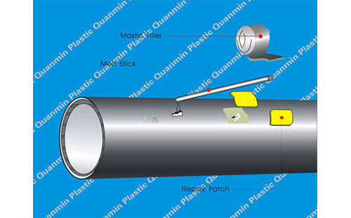 聚乙烯涂层打毛,然后将损伤部位的聚乙烯层修切成圆形,边缘应剖成锐角。在孔内填满与管道防腐补伤片配套的管道防腐补伤棒或管道防腐补伤胶,然后贴上管道防腐补伤片,其大小应保证其边缘距聚乙烯层的孔洞边缘不小于100mm。贴补时应边加热,边用辊子滾压或戴耐热手套用手挤压,排出空气,直至管道防腐补伤片四周胶粘剂均匀溢出。